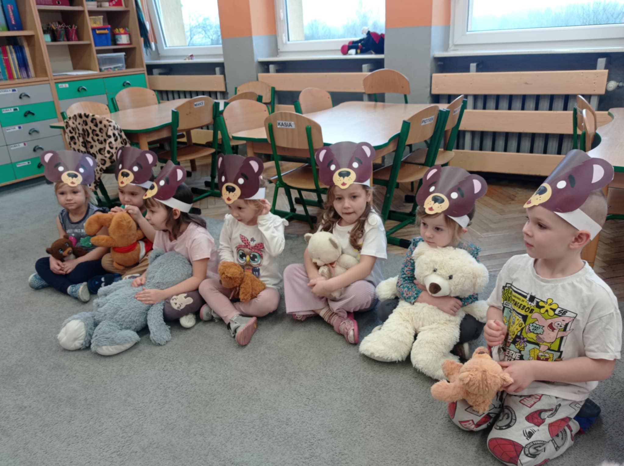 grupa dzieci w maskach misiów, trzyma w ręku swoje misie