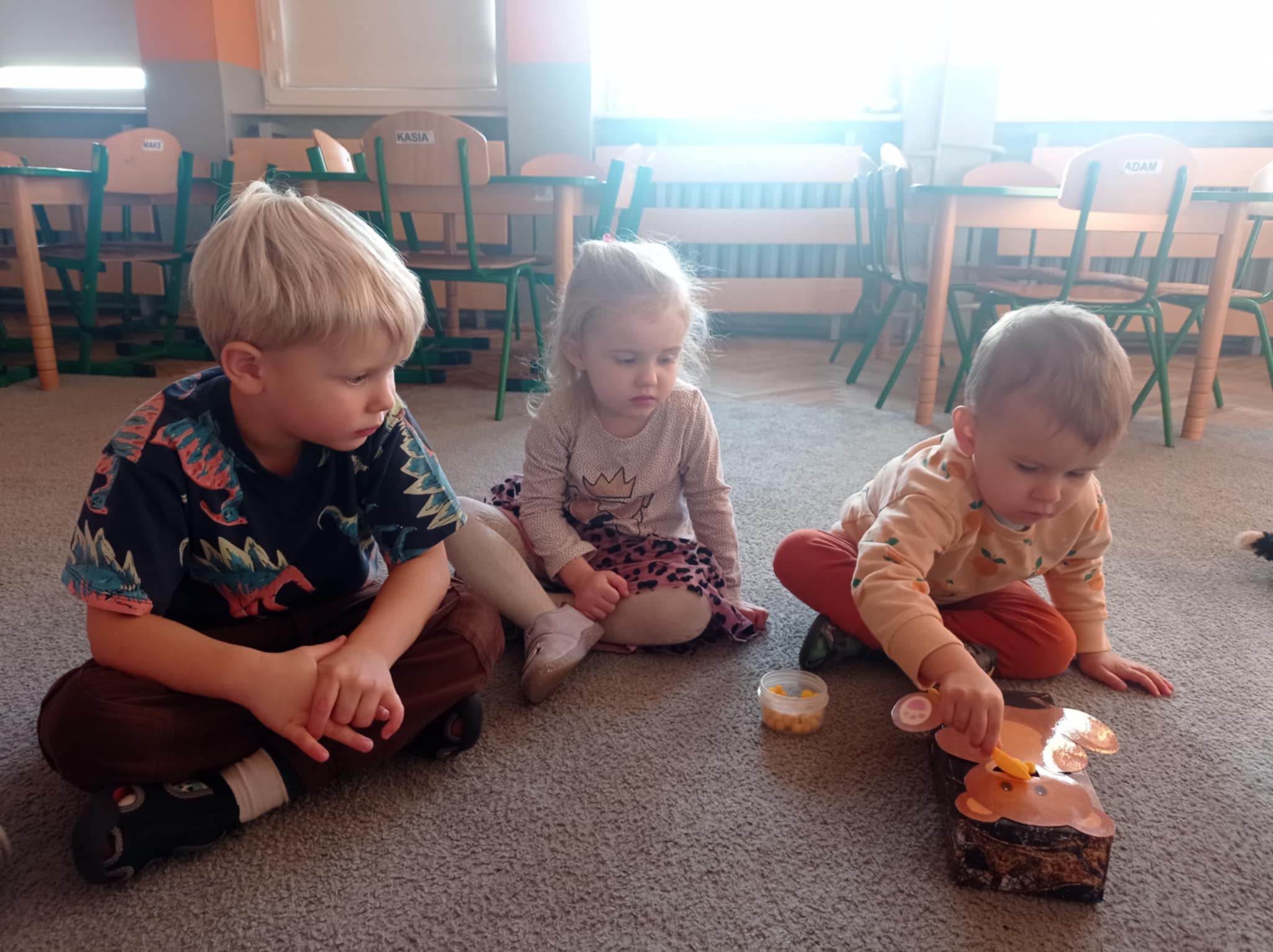 troje dzieci na dywanie, chłopiec ma w ręku łyżkę
