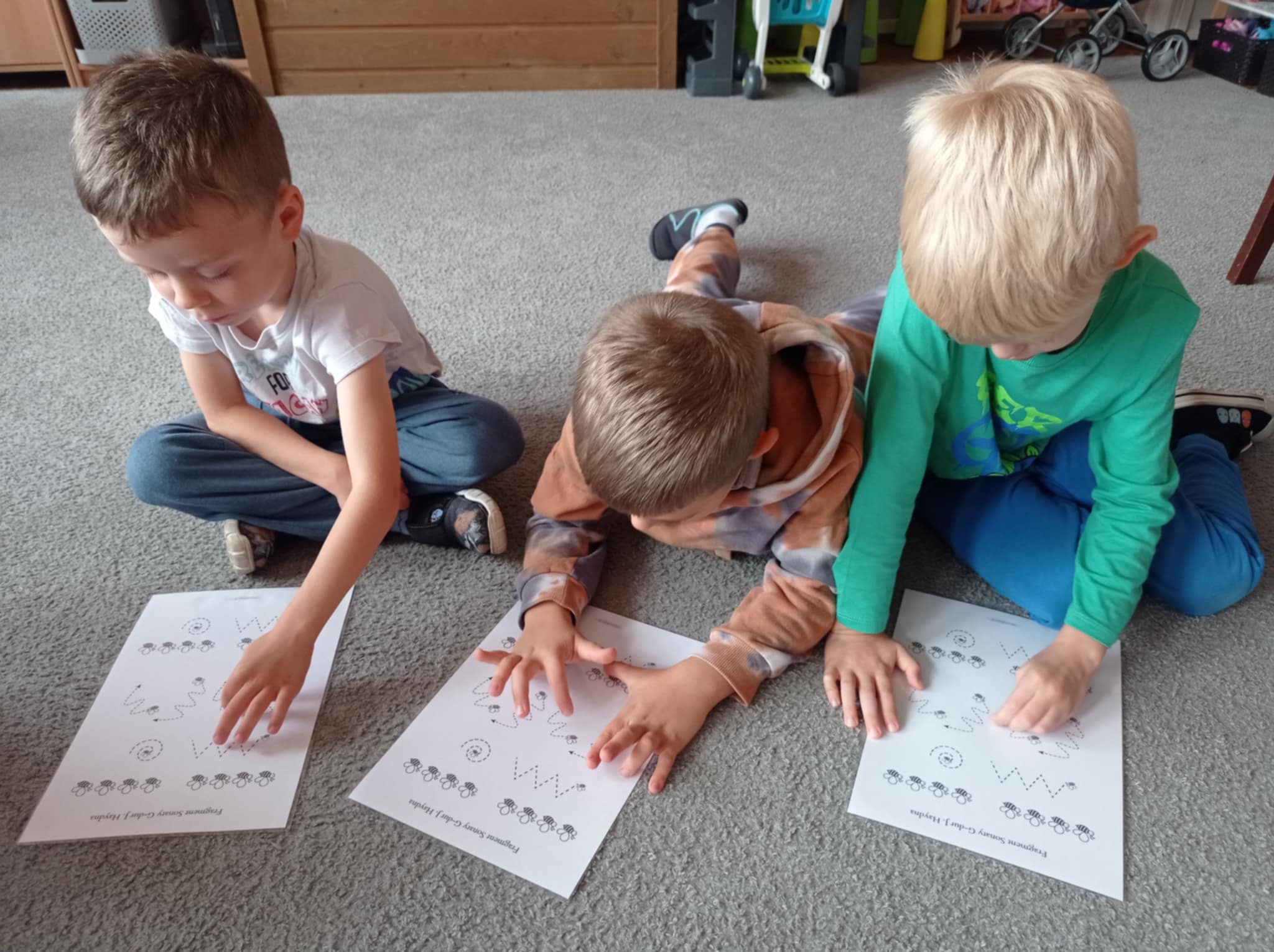 dzieci siedzą na dywanie, wodzą palcem po obrazku