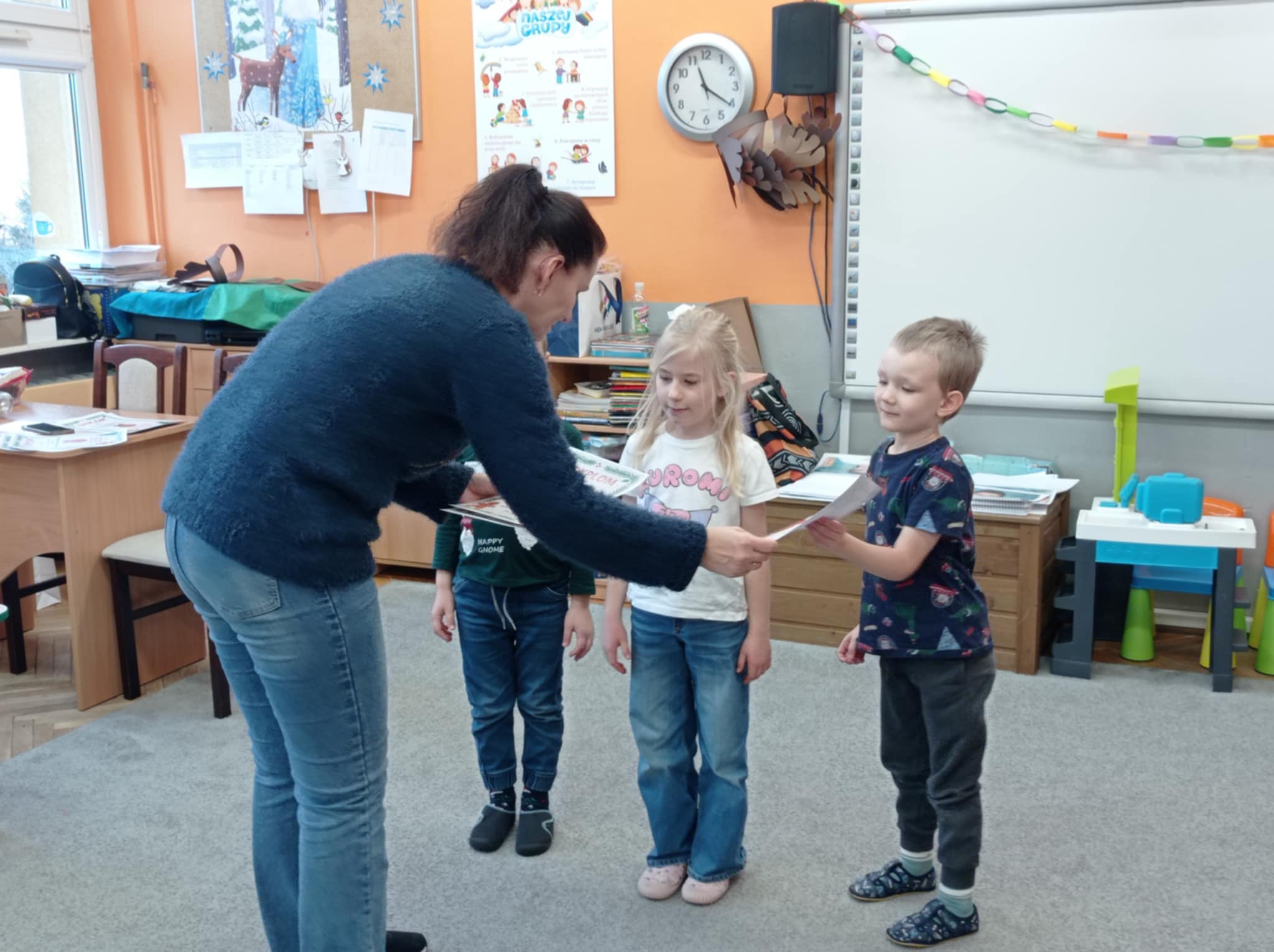 nauczycielka wręcza dzieciom dyplomy