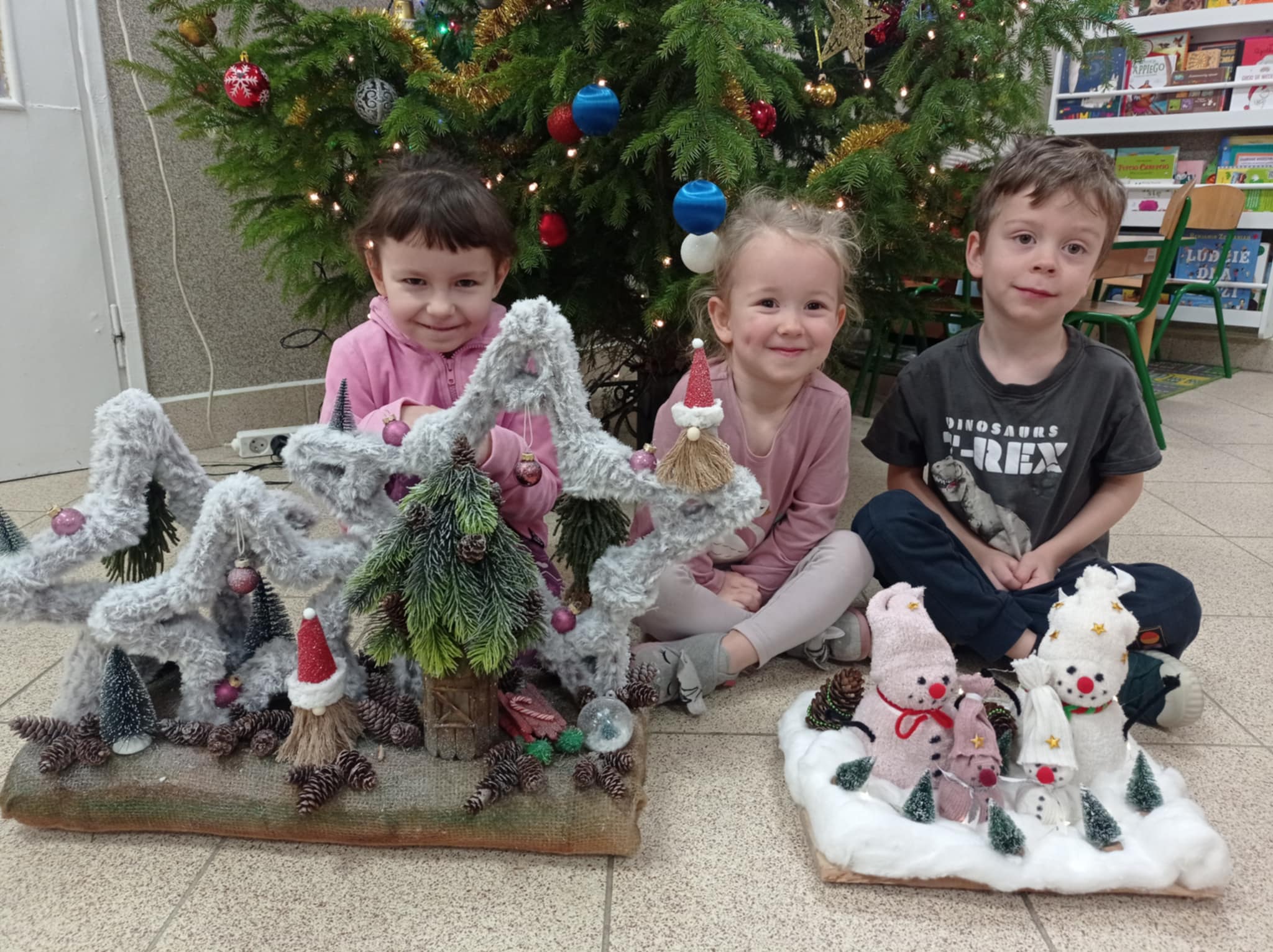 troje dzieci siedzi przed choinką, trzyma w ręku prace wykonane na konkurs