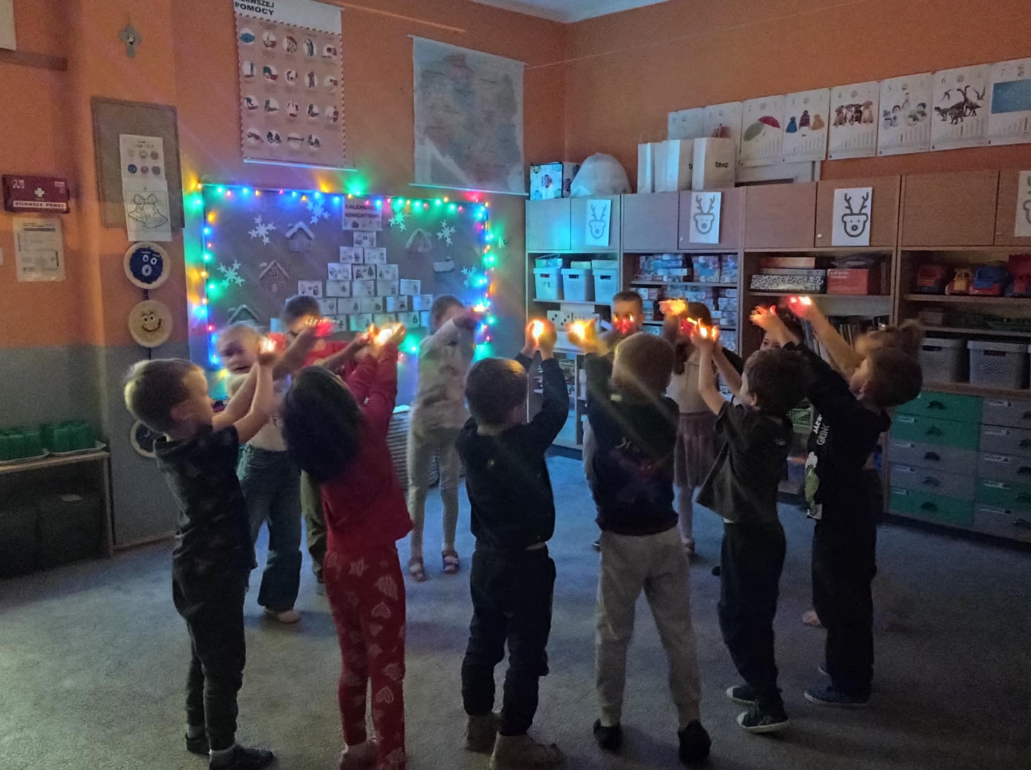 w sali półmrok, dzieci podnoszą światełka do góry