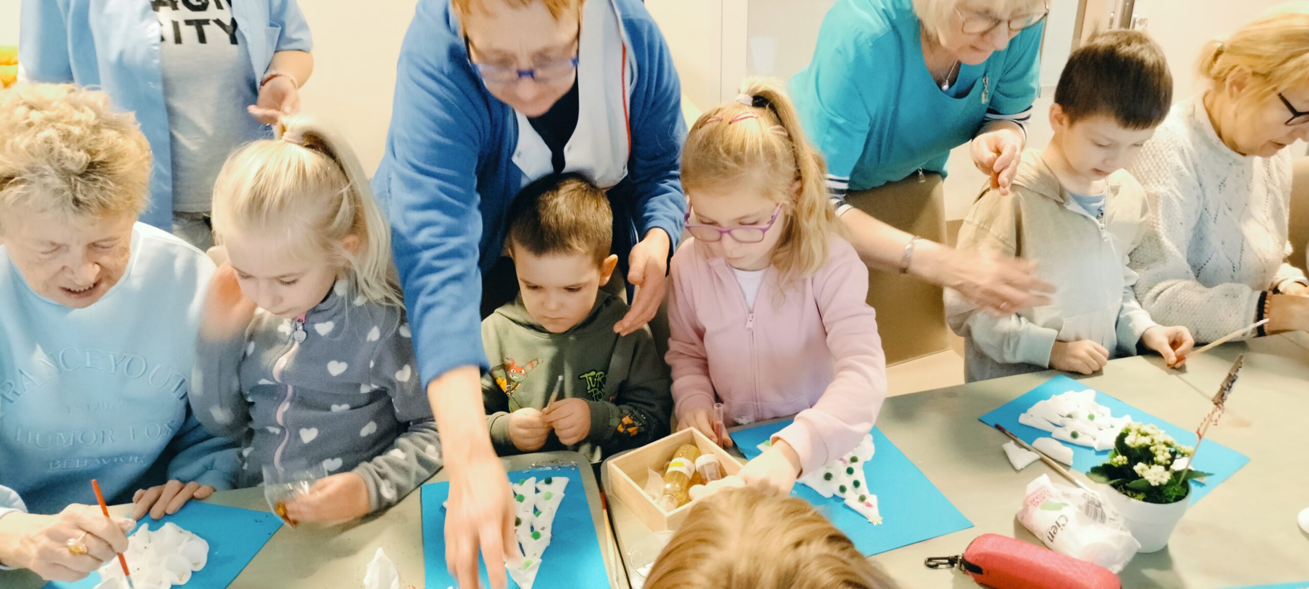 Podopieczna pomaga chłopcu i dziewczynce w wykonaniu kartki