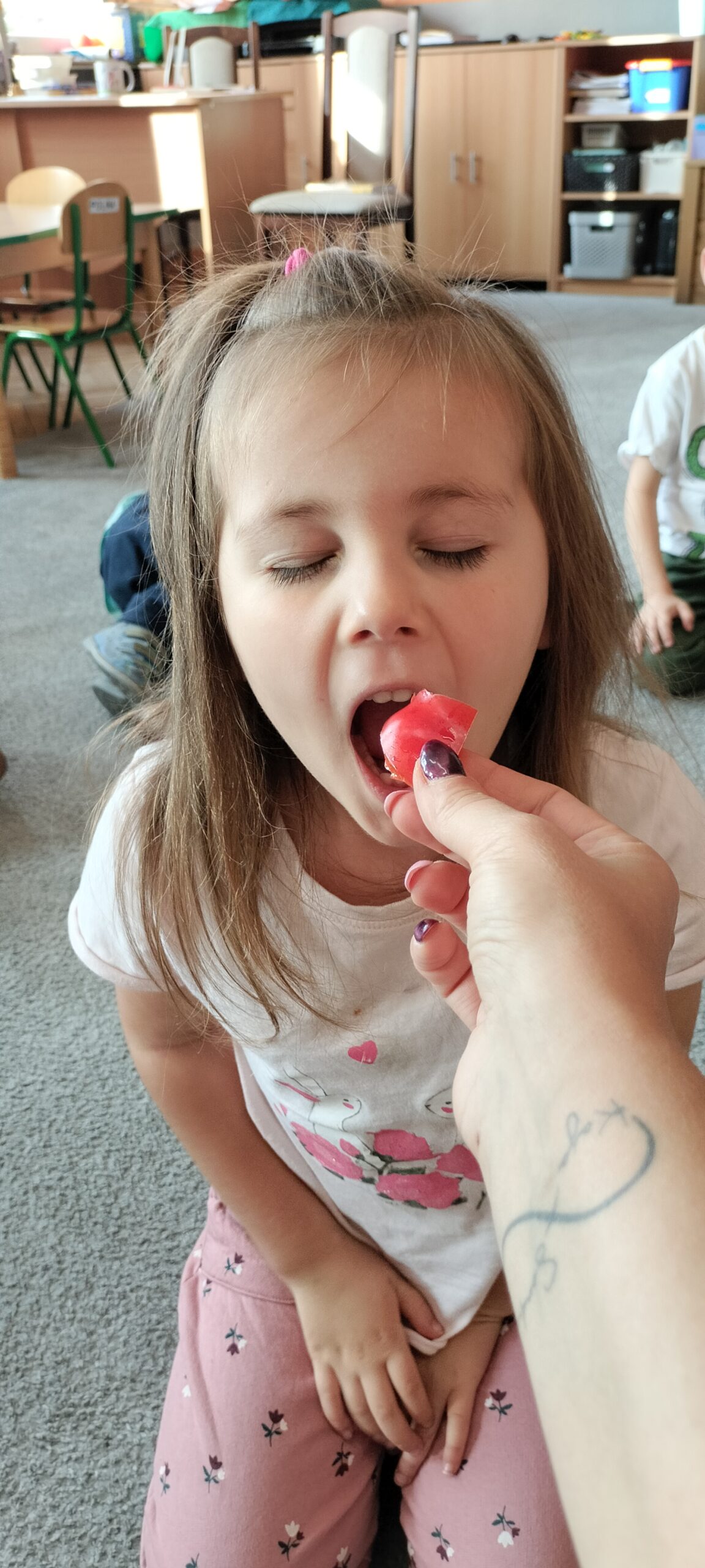 Dziewczynka z zamkniętymi oczami próbuje kawałek pomidora